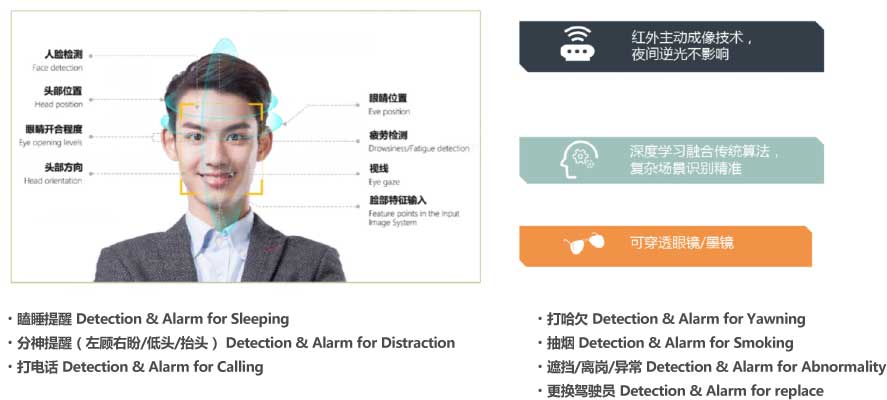 系統對駕駛員的頭部、面部及眼部動作等進行實時檢測,針對駕駛員疲勞及注意力分散等危險狀態進行及時有效的預警,并支持無線通信將圖像、視頻實 時傳輸至云管理平臺,實現遠程監管和風險評估。