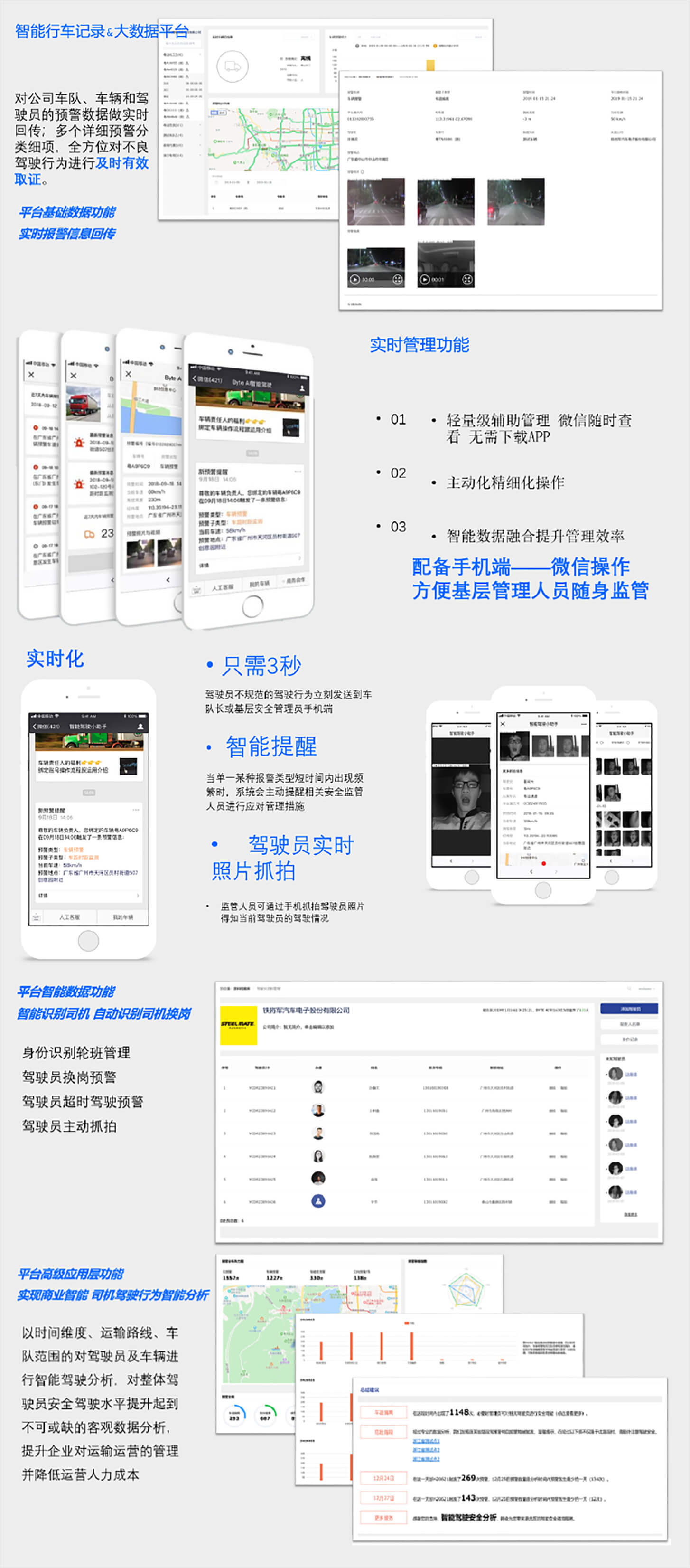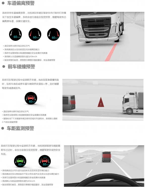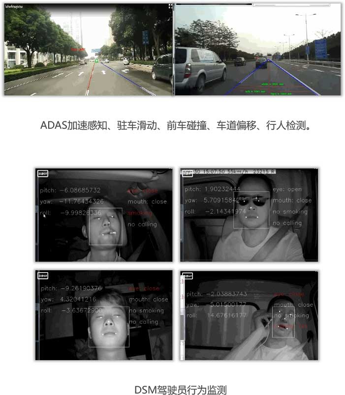 智能視頻監控報警裝置集成ADAS前向駕駛輔助及DSM駕駛員監測功能,通過提前預警減少碰撞事故,所有預警信息也會自動上傳至智能駕駛風險防控平臺, 為車隊精細化管理、駕駛員風險評估提供數據支撐。是一款兼容車聯網數據監控服務平臺的智能安全駕駛輔助產品,基于圖像算法和深度學習算法,可實 現對人(疲勞駕駛/分神/抽煙/打電話等)、車(急加速/急減速/超速/定位等)、路(車道偏離/前車碰撞/車距時距監測/駐車滑動等)三個交通要素的 全面的實時預警與監控,并具備證據圖片、視頻保存與遠程查看等功能,可實現與設備終端/監管平臺的對接,可根據不同行業與客戶的需求進行軟件功 能的個性化定制。